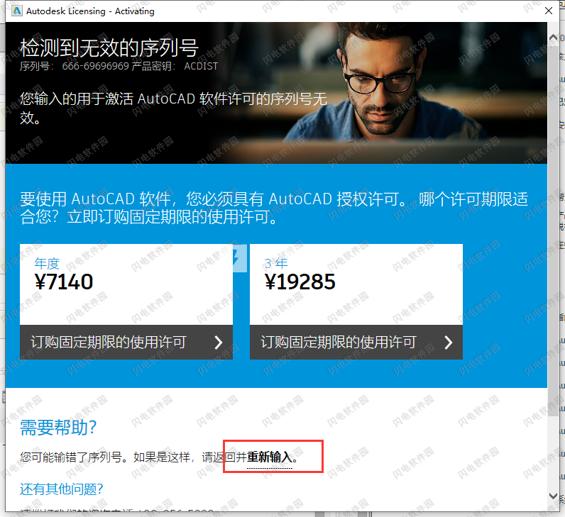 注意:如果我们如果我们在运行程序的时候没有断网的话也没问题,继续根据提示输入序列号、密钥,然后点击下一步会出现一个窗口提示,如下图所示,点击重新输入