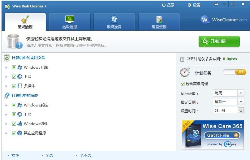 Wise Disk Cleaner是一款功能强大、操作简单的磁盘垃圾清理工具。Wise Disk Cleaner界面清新简洁,支持简体中文版,容易操作清理不需要的系统垃圾文件,使系统运行得更快更高效。Wise Disk Cleaner具有强大的系统垃圾扫描与清理服务,可以帮助用户轻松清理多种系统垃圾,有了它你就能轻松滴把垃圾文件请出你的电脑,它能识别多达50种垃圾文件哦。