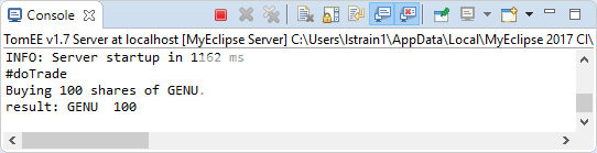 右键单击服务器,如果服务器未运行,请选择“启动”。启动服务器后,消息将流式传输到Console视图。观察说明TraderJEE5已成功部署的消息。