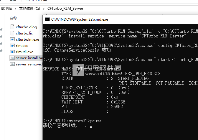 2、将文件夹"CFTurbo_RLM_Server"复制到计算机 (文件夹路径必须尽可能简短)。以管理员身份运行 CFTurbo_RLM_Server\server_install.bat,等待新服务"CFTurbo_RLM_Server"安装并启动