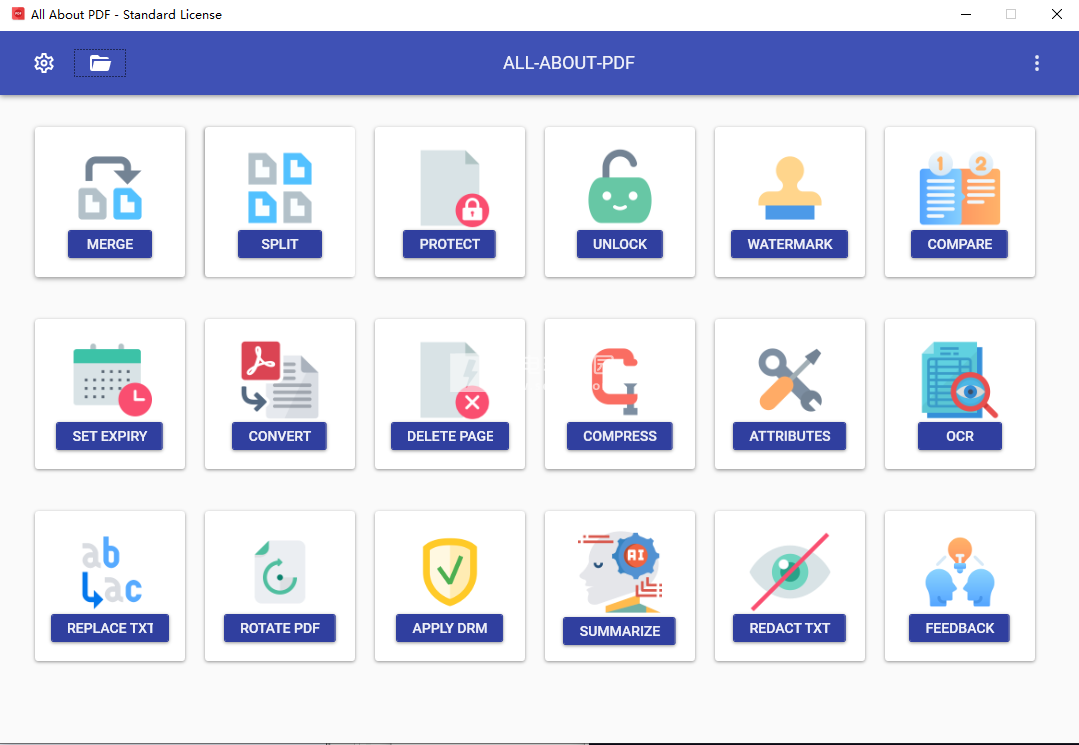 All About PDF是实用的PDF应用程序,提供PDF处理所需要的各种功能,包括合并、拆分、保护、压缩、转换等等,并且值得注意的是,能够保持原始文档的完整性,处理速度也非常快。此外,还可以从任何PDF文件中删除用户和所有者PDF密码,以及使用文本或图像向PDF的所有页面添加水印,可设置PDF过期,设置一定日期后不再有效。