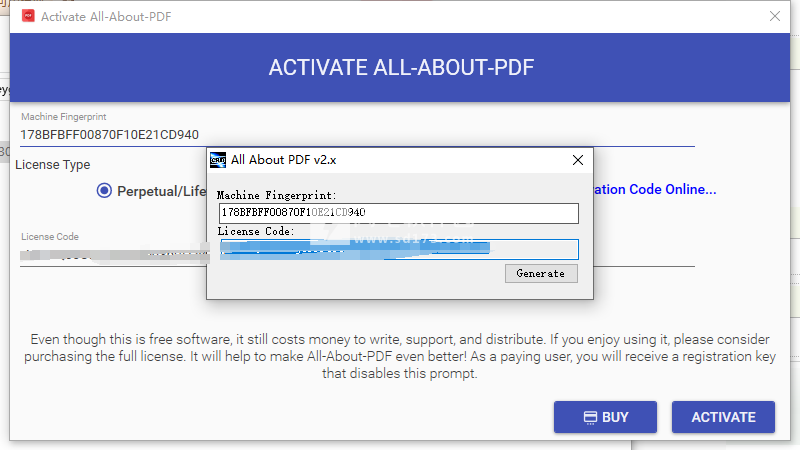4、安装完成,使用keygen激活,在程序中选择activate-Perpetual,将机器信息复制到注册机中,点击生成,获得许可证代码复制到软件中,点击激活