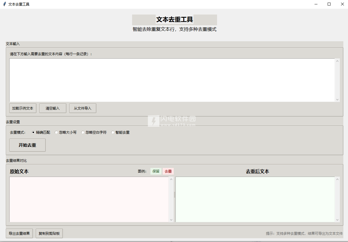 文本去重工具是一个简单易用的文本智能检测和去重复工具,提供多种模式可选择,轻松获得结果,并直观清晰显示前后对比,一键导出保存。