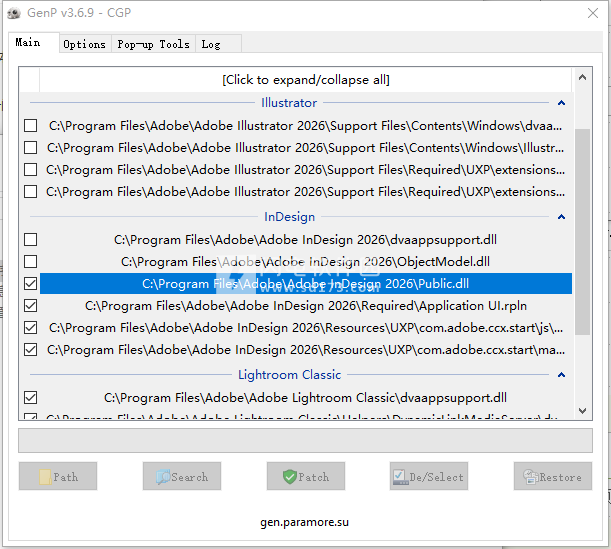 3、点击安装并等待,完成后不要运行软件,管理员身份运行Adobe-GenP-3.6.9-CGP,先点击search搜索您的软件,完成后,点击patch进行修补破解即可