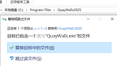 4、安装完成,将patched中的QuayWalls.exe复制到安装目录中,替换