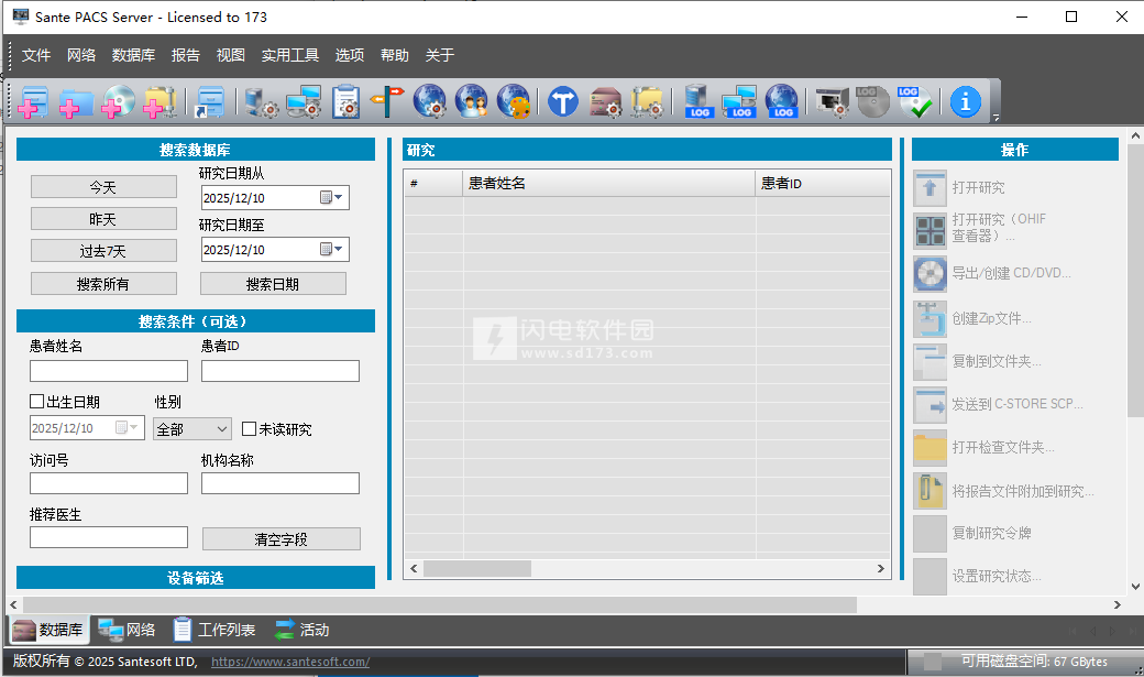 Sante PACS Server是一个用于医学图像的存储、存档、管理、查看和刻录的软件!提供一个简单的用户界面,简单的操作过程,轻松作为整个档案的本地备份服务器,也可以从网络访问,同时还能本地保存归档的旧部分,是一个非常便捷欸非常低成本的解决方案!四大模块以及五种非常实用的工具、工具和流程,方便迁移、转发、接收、配置以及自动刻录CD/DVD光盘并打印标签!