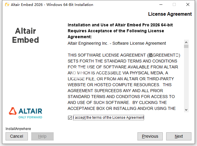 3、Altair Embed Pro 2026 Win64或者Altair Embed Simulation Edition 2026 Win64,勾选接受协议