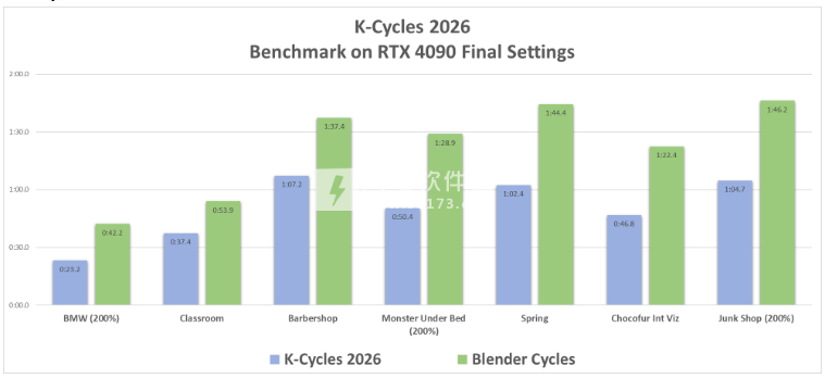 以下是性能表,比较了2026年配备RTX4090的K-Cycles与同一Blender版本的Cycles版本。测试时使用默认的Cycles最终渲染设置,噪声阈值为“0.01”,采样为“4096”,未使用去噪器。