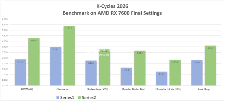 以下是性能图表,比较了2026年K-Cycles搭配AMD RX 7600与同一Cycles版本的Blender。测试时使用默认的Cycles最终渲染设置,噪声阈值为“0.01”,采样为“4096”,未使用去噪器。