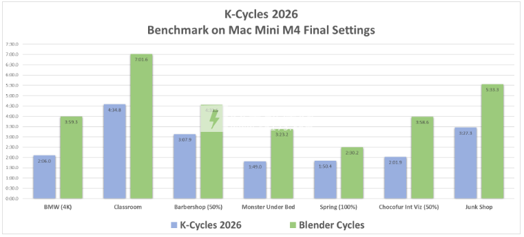 下面是性能表,比较了 K-Cycles 2026 年版 Mac Mini M4 与同一 Cycles 版本的 Blender。Blender场景的输出分辨率是调整的(见标签)。测试时使用默认的Cycles最终渲染设置,噪声阈值为“0.01”,采样为“4096”,未使用去噪器。