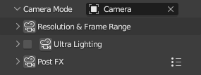 通过启用相机图标,可以即时在全局场景设置或分辨率/帧幅、超光照或后期特效的单独相机设置之间切换。