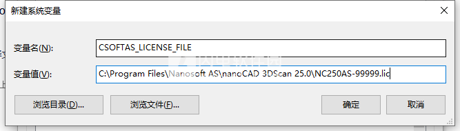 6、并创建系统环境变量:(默认情况下为CSOFTAS_LICENSE_FILE = C:\Program Files\Nanosoft AS\nanoCAD 3DScan 25.0\NC250AS-99999.lic)