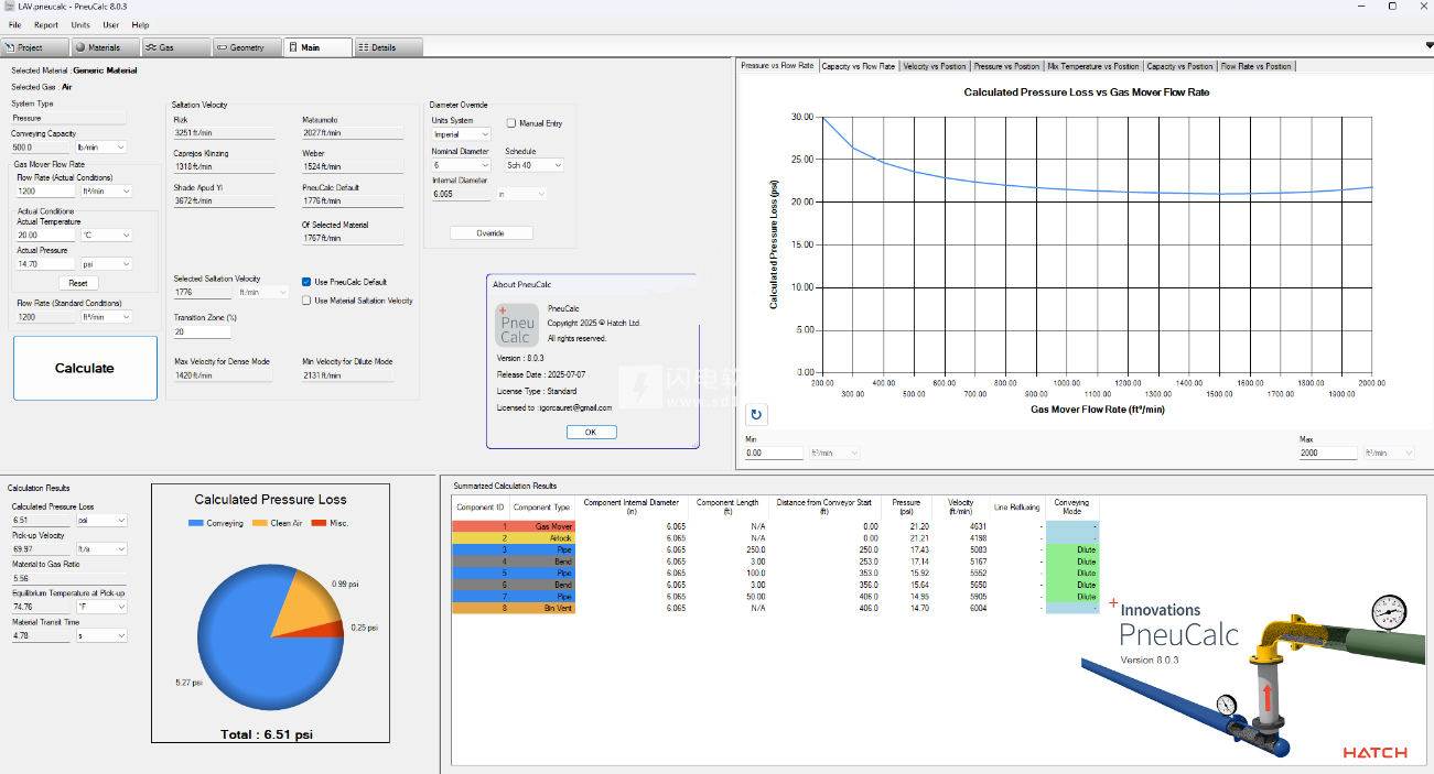 无论你使用的是压力系统还是真空系统,PneuCalc的功能和工具都能帮助优化你的设计。它显示稀释、致密和混合输送模式,计算材料跳跃速度,自动利用Geldart分组分类材料,并提供详细的管道段概述。
