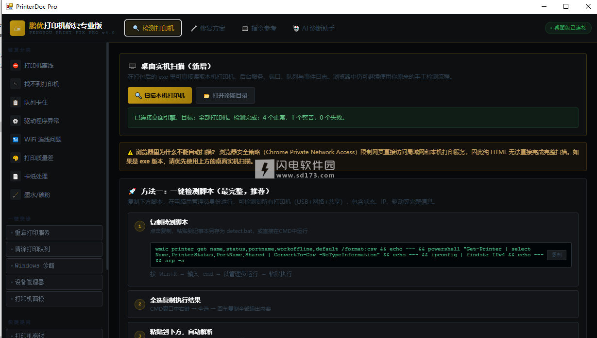 PrinterDoc Pro是一个实用的专业打印机诊断修复工具!智能化的检测功能,一键自动修复。所有连接的打印机智能自动全面检测,实时生成详细的诊断报告,有问题的以及可能有问题的地方都给你以不同的状态显示处理,并给予快速修复,适合所有有需要的用户收藏备用。