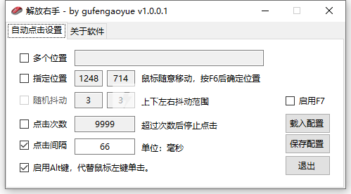 解放右手是一个简易的自动点击工具,适合大家在做重复任务或者玩电脑游戏的时候使用,丰富的设置选项,灵活选择,可保存配置,方便后续再次加载使用,针对各种需求轻松满足