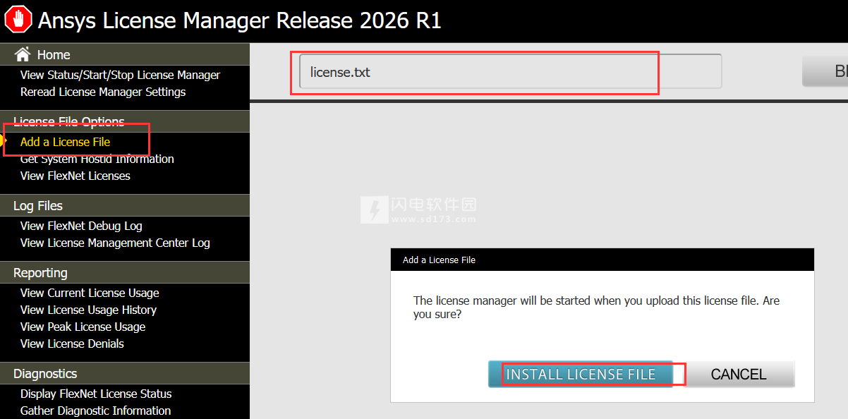 5、单击“Add a License File”>“Choose File”>浏览到文件“License.txt”>单击“INSTALL LICENSE FILE”