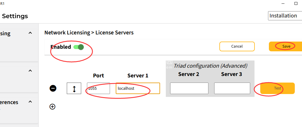对于FlexNet Publisher>许可证服务器,打开“Enabled启用”旋钮并输入