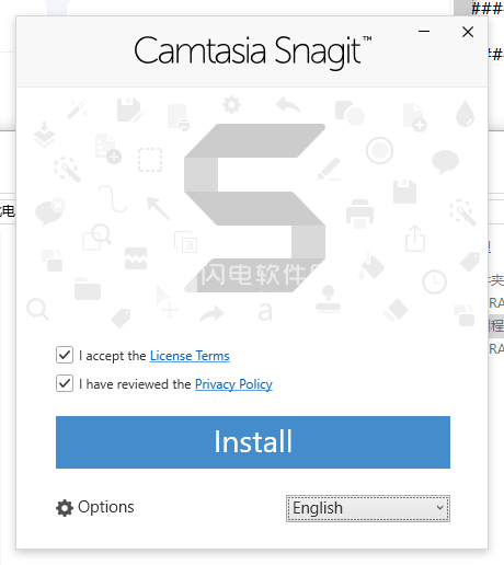 2、双击TechSmith_Snagit_2026.0.0_Build_7200_Multilingual_x64.exe安装程序,勾选我接受协议,点击options按钮进行安装设置