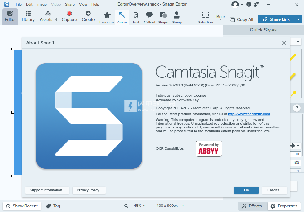 Snagit2026是功能强大的屏幕录制工具,使用可捕获屏幕上任何内容的屏幕截图或视频。可自由选择捕获类型,能够捕获屏幕上的所有内容。您可以选择你所需要的内容,支持快速捕获图像、视频或者全景图像,也可以自定义进行图像捕获的设置,包括自动添加效果、共享到目的地等。视频捕获可以设置音频或者视频的网络摄像头设备,支持设置并保存常用的捕获设置,也就是保存预设,保存或您随时可以打开该列表以进行捕获设置的选择,不需要再从头进行设置,从而节省时间和提高效率。使用软件,您可以选择屏幕中部分区域的捕获,也可以选择全屏以及某个特定窗口的捕获,此外,还具有编辑功能,方便进行捕获后的内容添加,从而更直观更详细的展示您的屏幕截图和屏幕录像