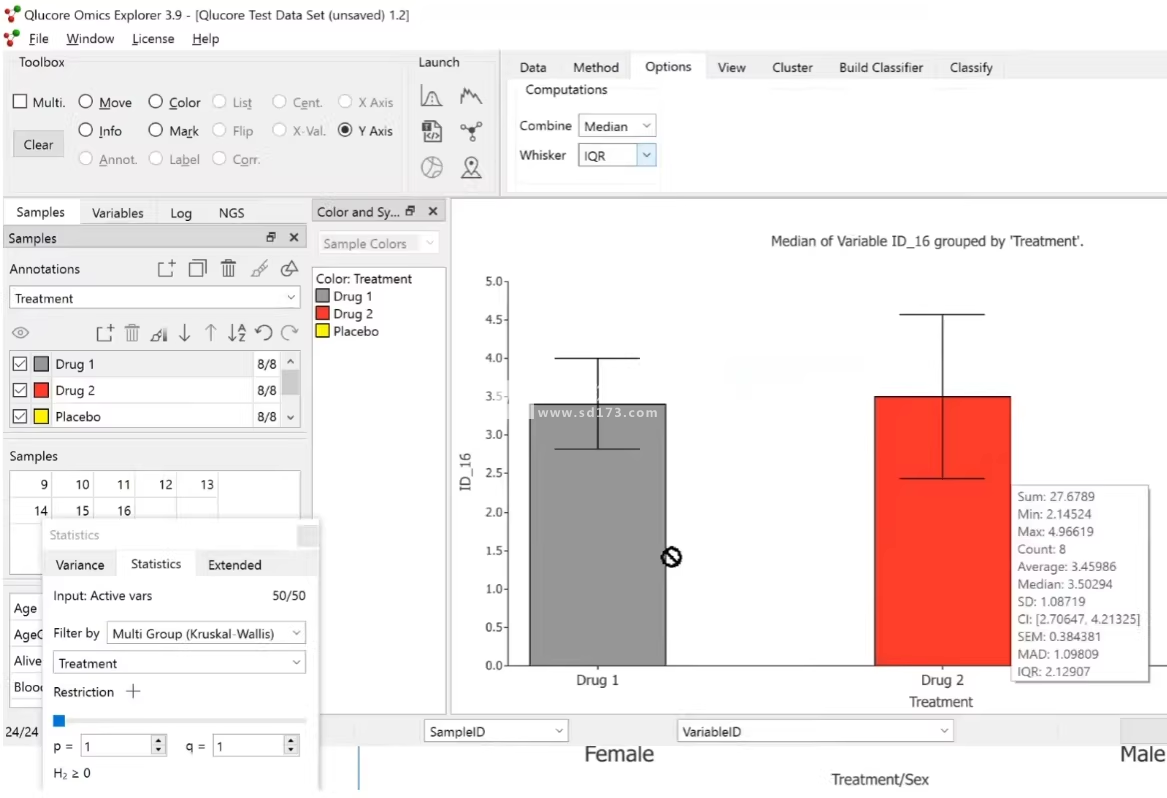 集成了R的Open API,并开放使用多种其他统计方法。该程序附带了一系列测试,示例包括Limma和Mann Whitney。