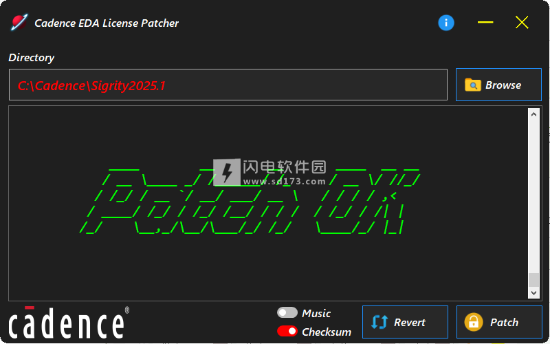 4、安装完成,将CadenceLicensePatcherWin.exe复制到本地磁盘并运行。选择您的cadence产品目录,点击Patch按钮,等待补丁确定。